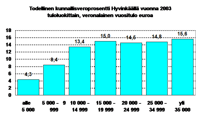 Kun veronalaiset tulot olivat 15 000 – 19 999 euroa, oli todellinen veroprosentti jo 15,0 prosenttia, siis enemmän kuin keskimäärin. Tähän tuloluokkaan kuuluu paljon eläkeläisiä, jotka eivät saa ansiotulovähennystä. Heitä korkeammissa tuloluokissa todellinen veroprosentti oli jopa hieman alempi, vaikka tulot olivat suuremmat. Myöskään suurituloisimmat, yli 35 000 euroa vuodessa ansainneet, eivät maksaneet kunnallisveroa juurikaan keskimääräistä enempää.