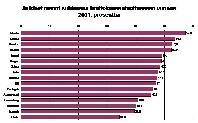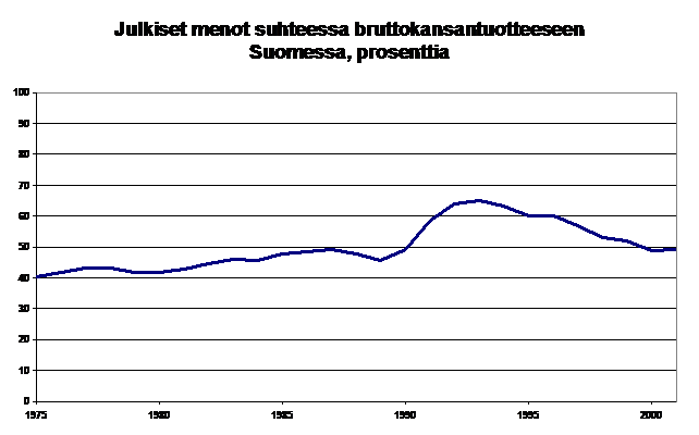 prosenttia. Julkisten menojen suhde bruttokansantuotteeseen oli Suomessa siten